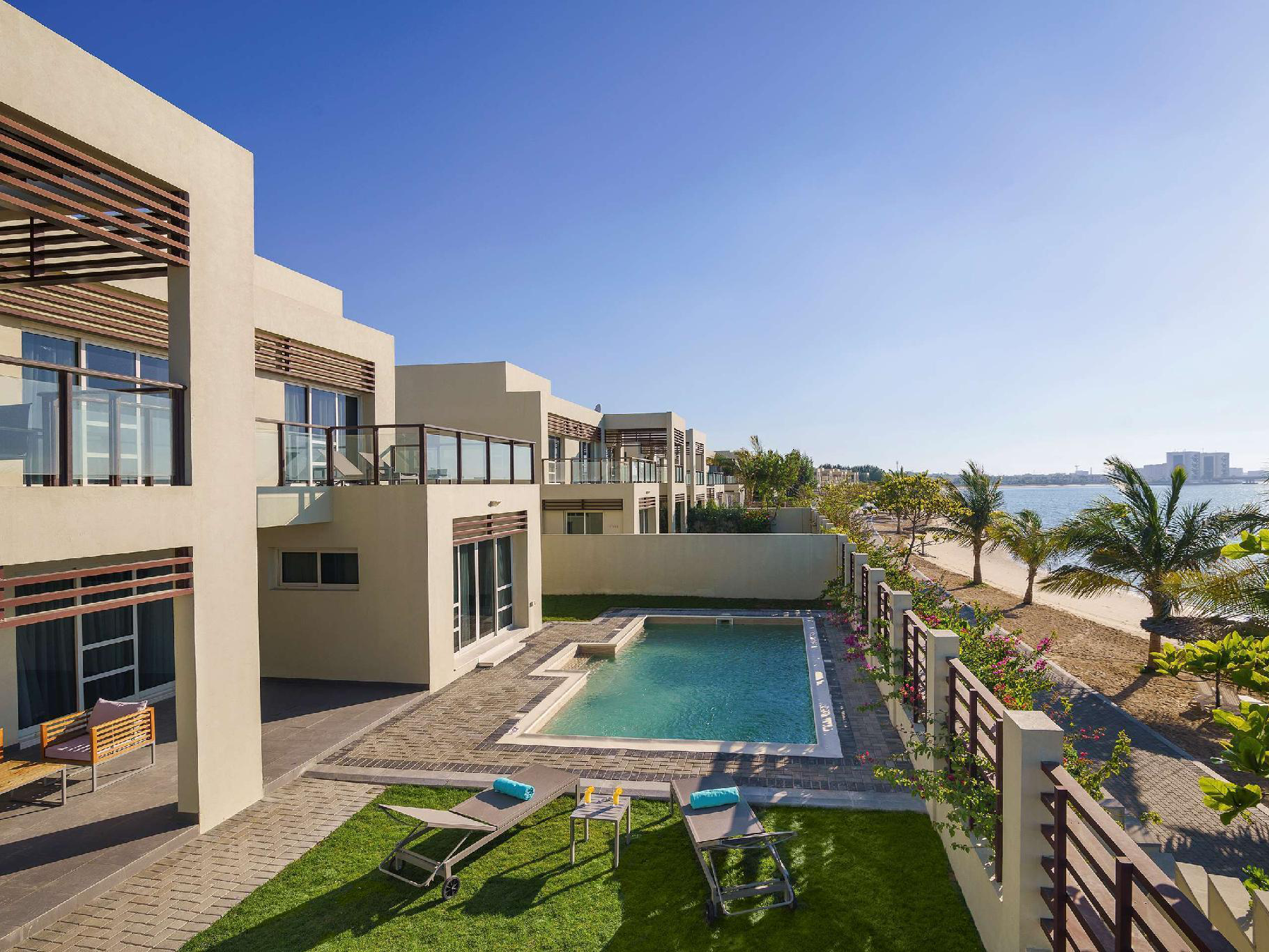 Jannah Hotel Apartments and Villas offers a serene escape with its spacious four-bedroom villas, each featuring temperature-controlled private pools and lush gardens. These villas provide direct beach access, allowing guests to enjoy the pristine shoreline at their leisure. The accommodations are designed for extended stays and group getaways, with expansive living areas, fully equipped kitchens, and personalized concierge services. Guests can indulge in spa treatments, participate in adventure activities such as mountain climbing and visits to the Pearl Farm, and explore the local culture and natural beauty of Ras Al Khaimah.